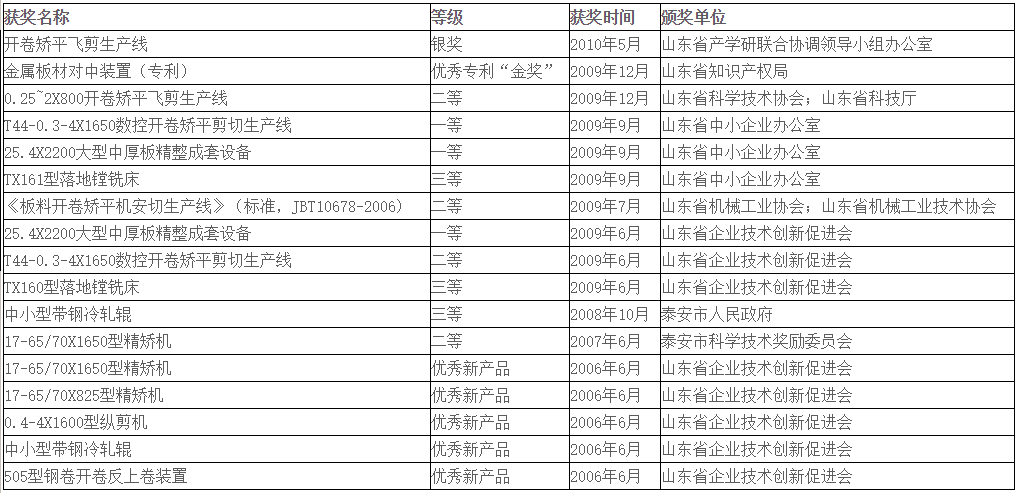“25.4×2200大型中厚板精剪成套設(shè)備”榮獲中國機械工業(yè)科技進(jìn)步二等獎和山東省科技進(jìn)步二等獎,并被認(rèn)定為國家重點新產(chǎn)品;