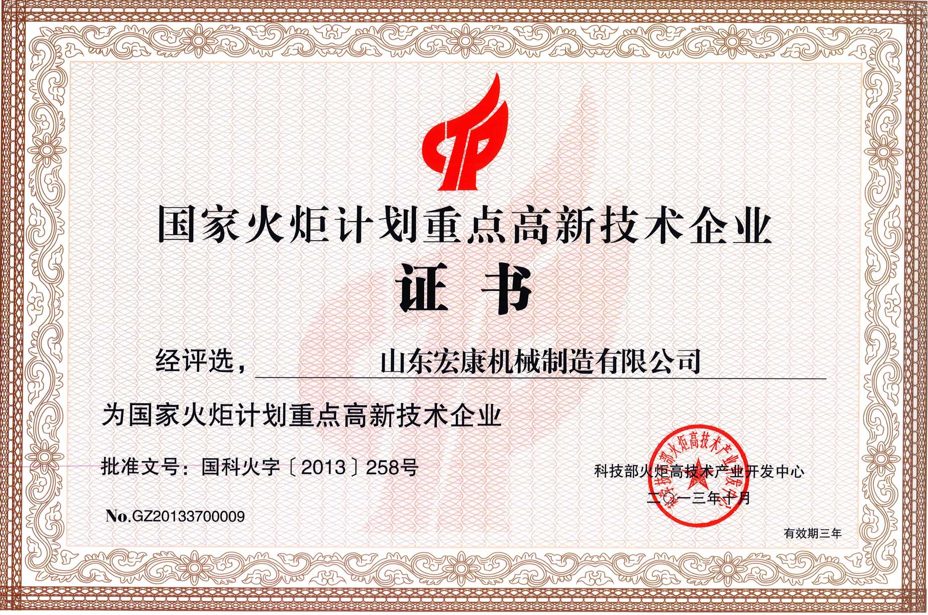 根據(jù)國家科技部火炬中心《關(guān)于發(fā)布2013年國家火炬計劃重點(diǎn)高新技術(shù)企業(yè)評選結(jié)果的通知》(國科火字〔2013〕258號),集團(tuán)公司被評選為國家火炬計劃重點(diǎn)高新技術(shù)企業(yè)。